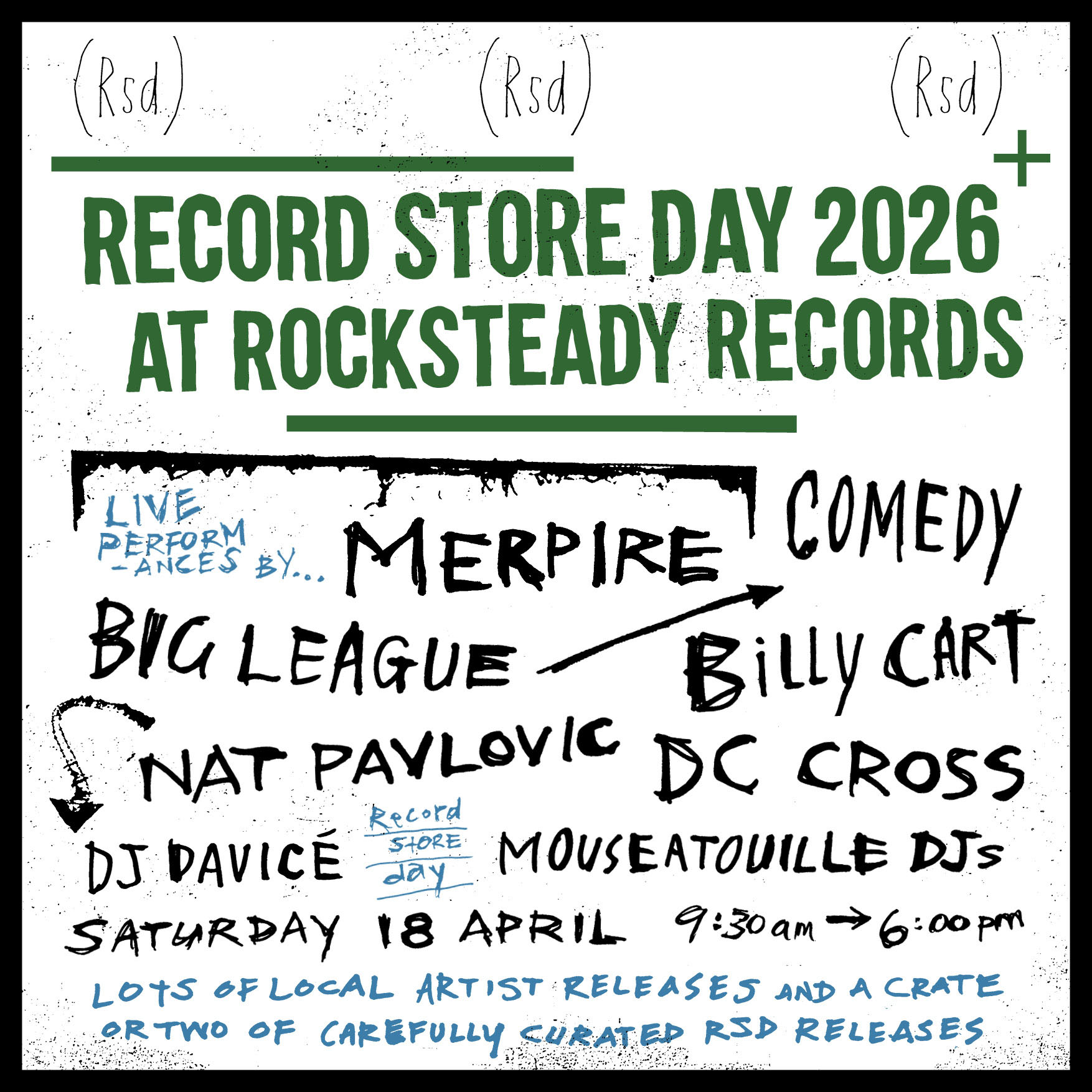 From 9:30AM, we’ll have loads of local vinyl, a craftily curated crate or three of RSD releases, DJ sets from DJ Davicè and the Mouseatouille DJ Team PLUS live performances from DC Cross, Merpire, Billy Cart, Nat Pavlovic, Big League and Comedy.